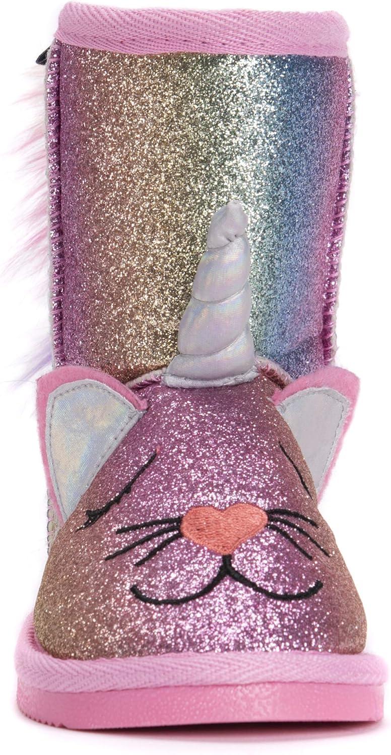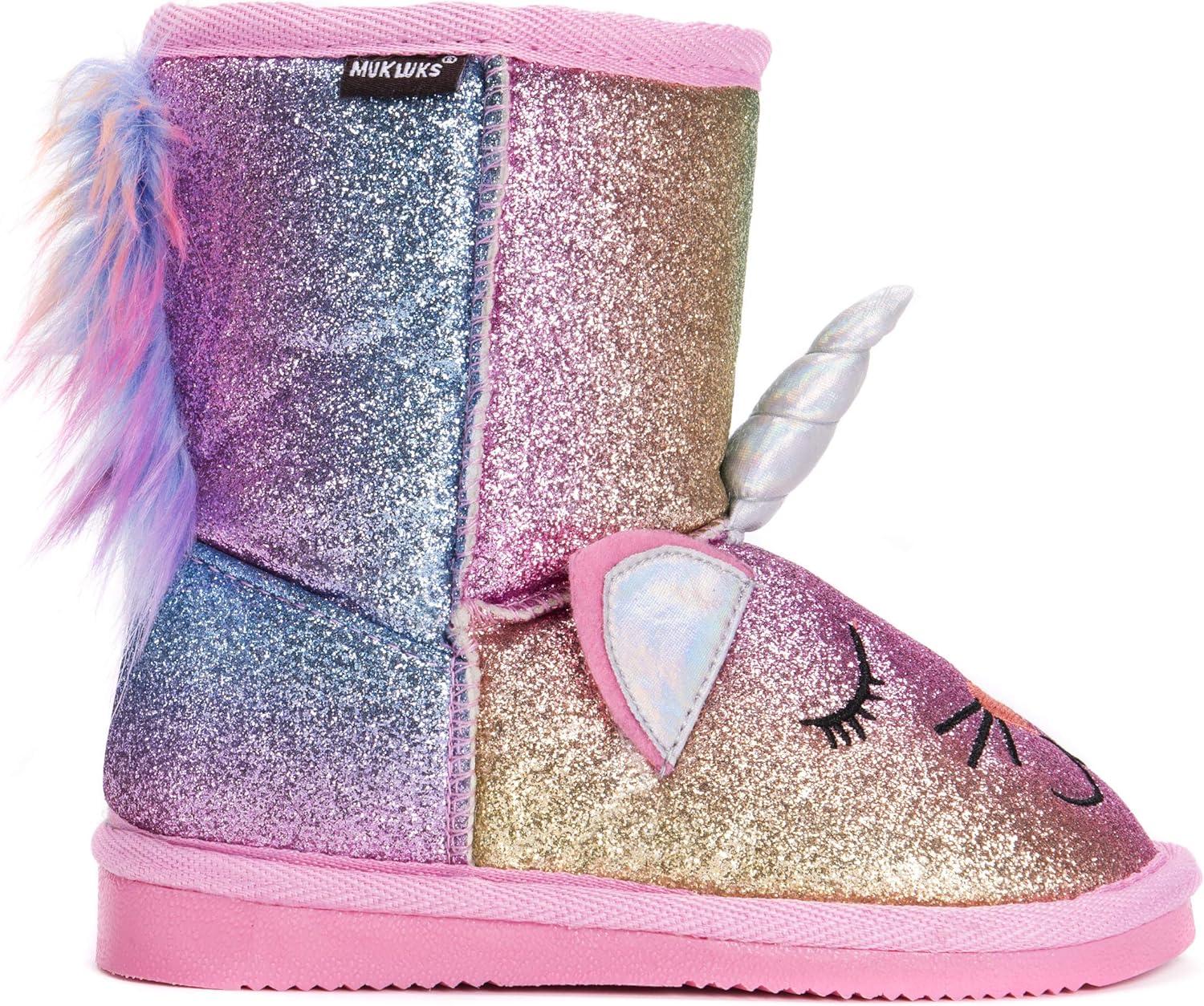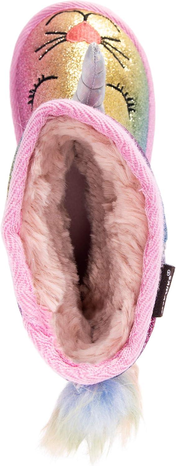 Your favorite mini will love MUK LUKS kids averly unikitten boots! An easy pull-on style for kids on the go, These adorable booties feature a fun and glittery unikitten design, durable tpr sole, and warm Faux fur lining to keep tiny toes cozy. The little in your life will never want to take these sparkly rainbow boots off! Spot clean, no bleach, dry flat. Imported. – TPR Sole – 100% polyester Insole – 100% polyester Upper – 100% polyester Faux fur lining – no heel – US kids whole sizes 8-12 – half sizes should size up.