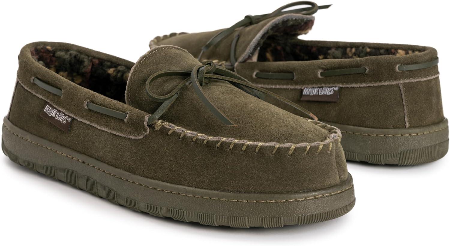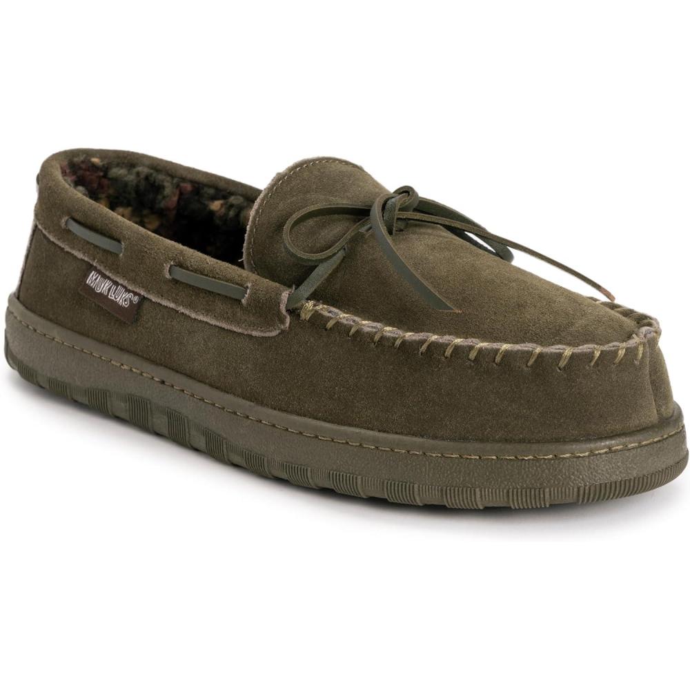 Classic and comfortable, MUK LUKS Men's Paul Printed Berber Suede Moccasins are great for casual style. Plush foam insoles offer a relaxing feel while the durable indoor/outdoor sole takes you wherever you need to go. Wipe with Damp Cloth. Do Not Bleach. Dry Flat. Imported. Indoor/Outdoor TPR Sole 100% Polyester Faux Fur Insole 100% Cow Suede Upper 100% Polyester Faux Fur Lining Foam Insole Men’s Whole Sizes 9-13 Multiple Color Options Available