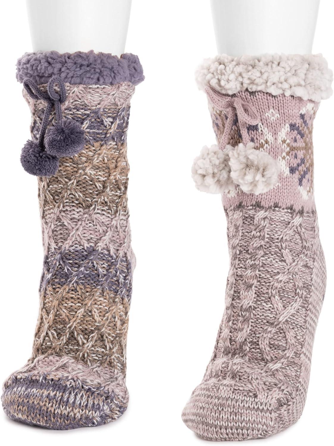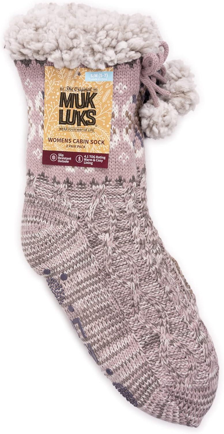 Cozy and warm, MUK LUKS® Women's 2 Pair Pack Tall Cabin Socks are the best for when temps drop. Sweet knits pair with ultra-soft faux fur to create a warm, comfortable sock you won’t want to take off. Machine wash cold on gentle cycle, no bleach, tumble dry low heat. Imported. – Non-Skid PVC Dot Sole – 100% Acrylic Knit – 100% Polyester Faux Fur Lining – 2 Pair Pack – Pom Detail – Multiple color options available – US Women's Sizes S/M (5-7), L/XL (8-10)