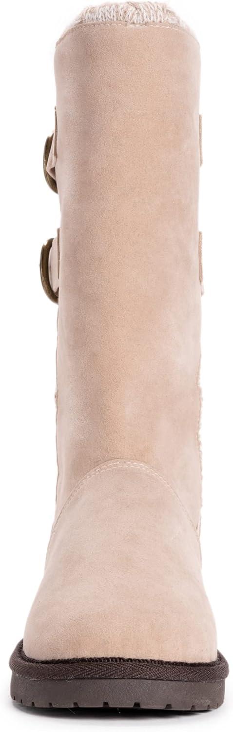 Fashion meets comfort & warmth with Essentials by MUK LUKS Women's Jean Boots. This mid-calf pull on boot features faux shearling lining and functional buckle detail. Wipe with a damp cloth, no bleach, lay flat to dry. Imported. – Treaded TPR Sole – 100% Polyester Brushed Tricot Insole – 100% Polyester Faux Suede Upper – 100% Polyester Faux Shearling Lining – Foam Insole – Water Resistant – Multiple color options available – Women’s Whole Sizes 6-11 – Half Sizes Size Up