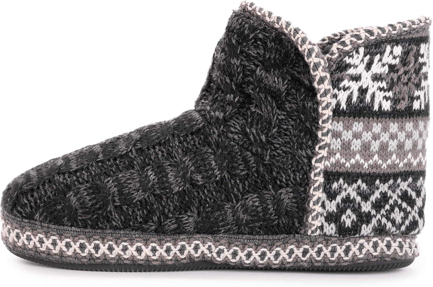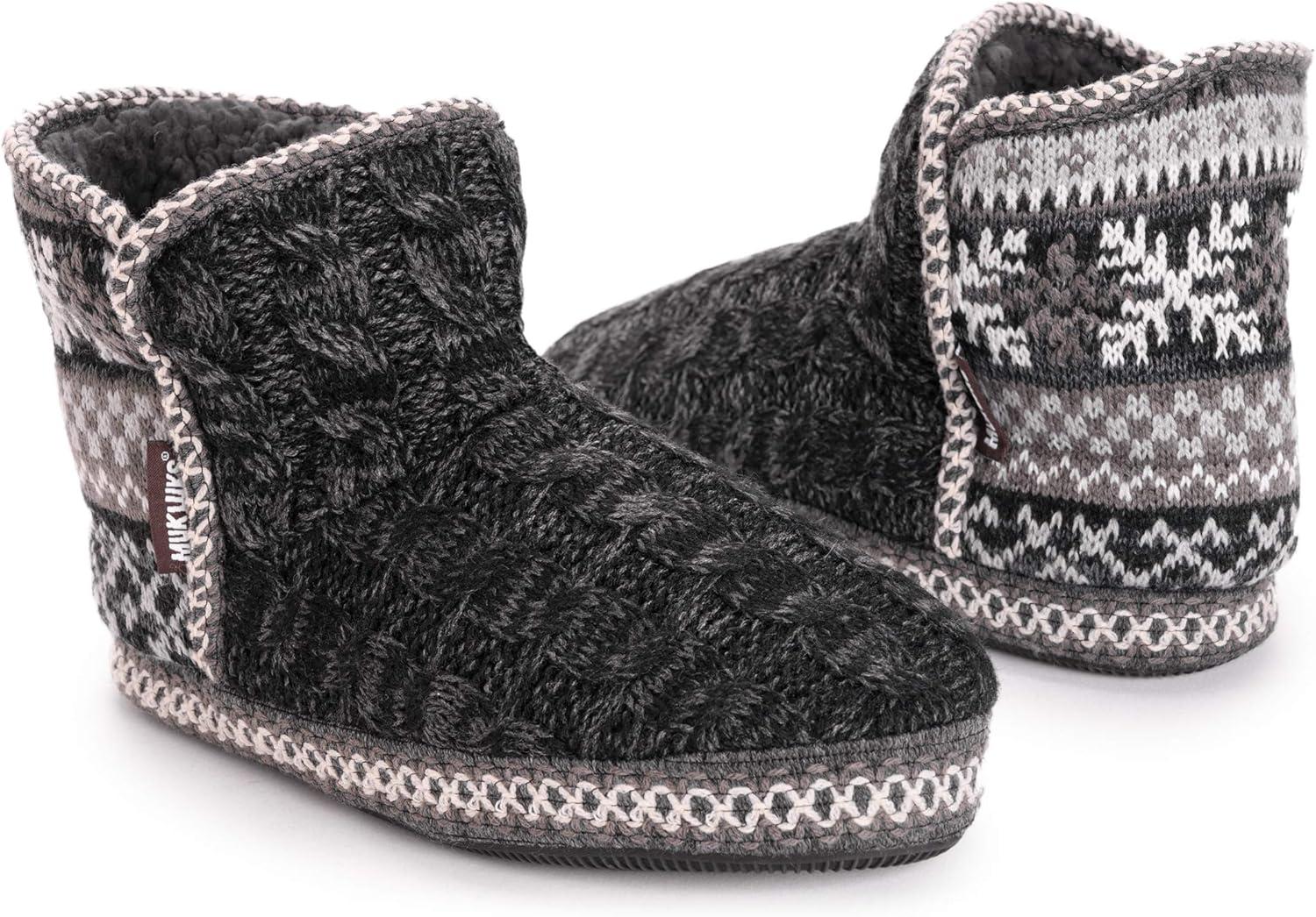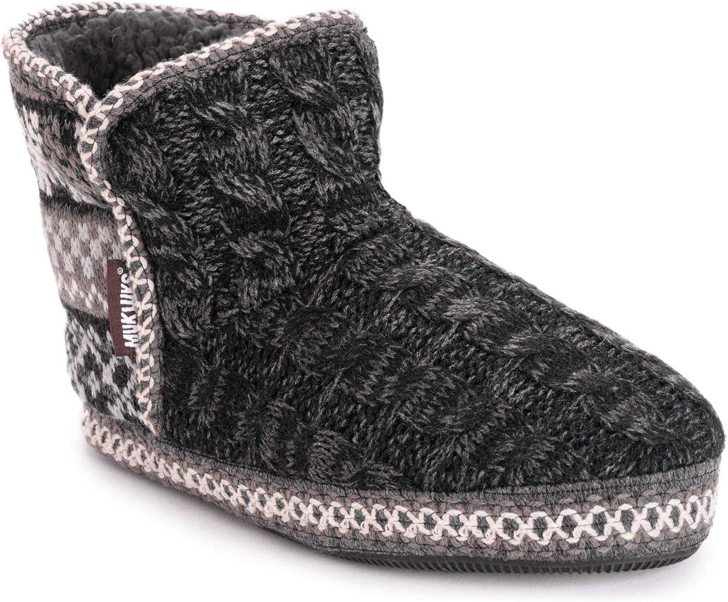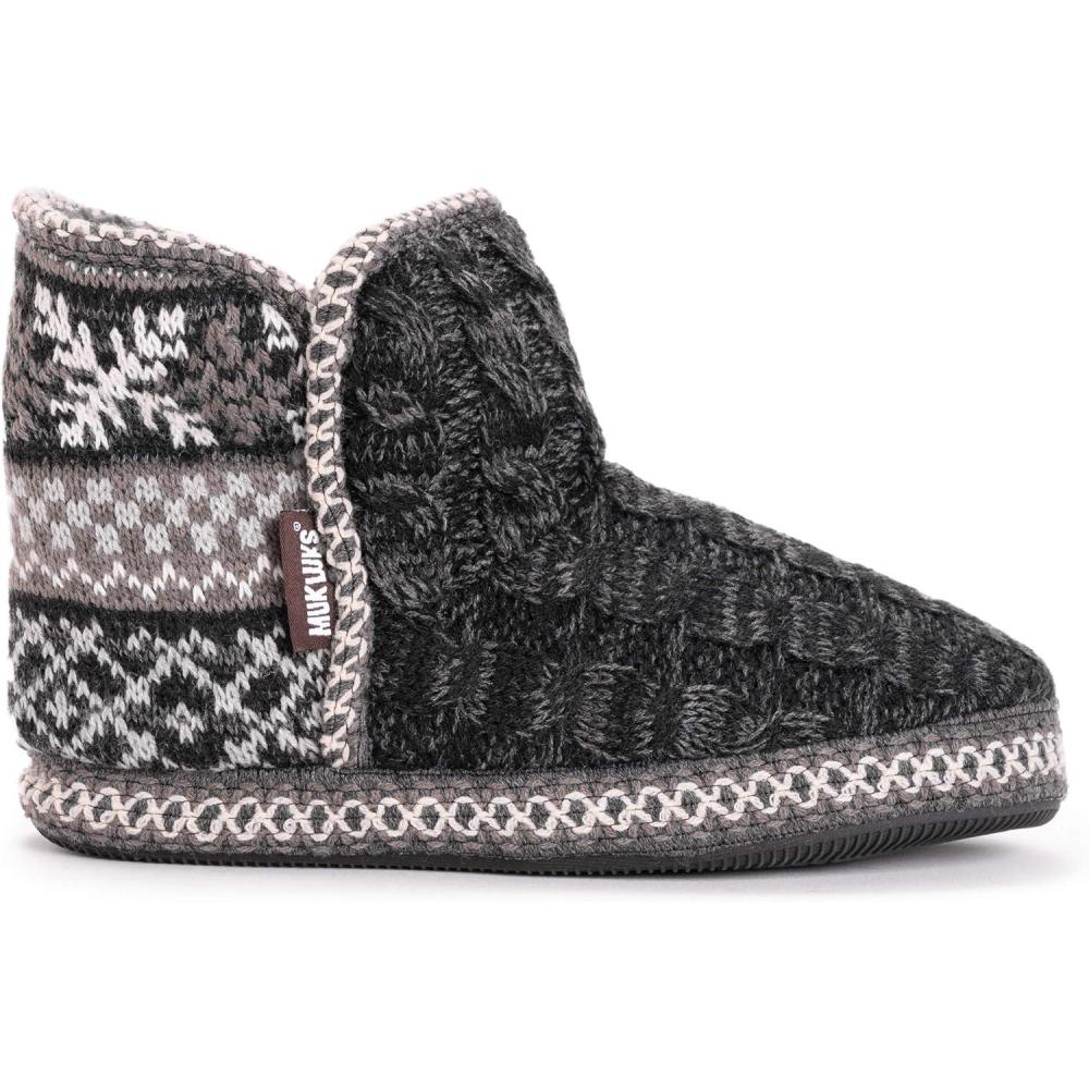 Comfy and classic, Muk Luks leigh bootie slippers offer warm and cozy style in so many adorable patterns! Plush faux fur lining and a luxurious relaxed fit compliment a durable sole that takes you where you need to go without sacrificing comfort. Hand wash in cold water, no bleach, dry flat. Imported.100% Polyester Faux Fur Lining.100% Acrylic Upper.