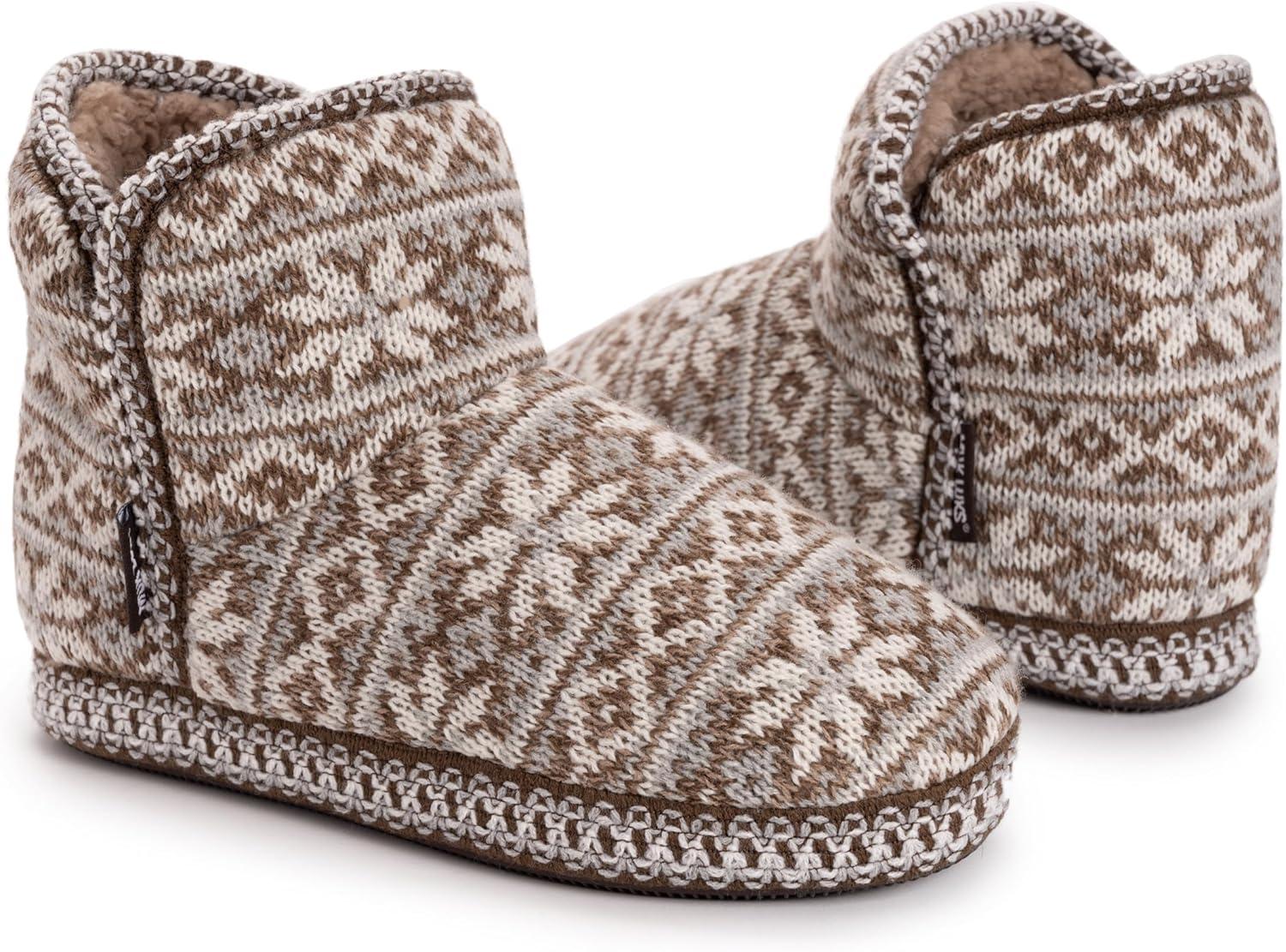 Comfy and classic, Muk Luks leigh bootie slippers offer warm and cozy style in so many adorable patterns! Plush faux fur lining and a luxurious relaxed fit compliment a durable sole that takes you where you need to go without sacrificing comfort. Hand wash in cold water, no bleach, dry flat. Imported.100% Polyester Faux Fur Lining.100% Acrylic Upper.