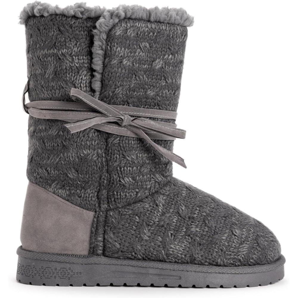 Soft and sweet Essentials by MUK LUKS Clementine Boots are a pretty way to warm up. Beautiful knits and cute tie detail pull your look together while durable sole keeps feet warm and dry. Spot clean, no bleach, dry flat. Imported. -TPR Sole -100% Polyester Faux Fur Lining -100% Acrylic Knit Upper -Foam Insole -Women's Whole sizes 6-11 -Half Sizes Size Up -Multiple color options